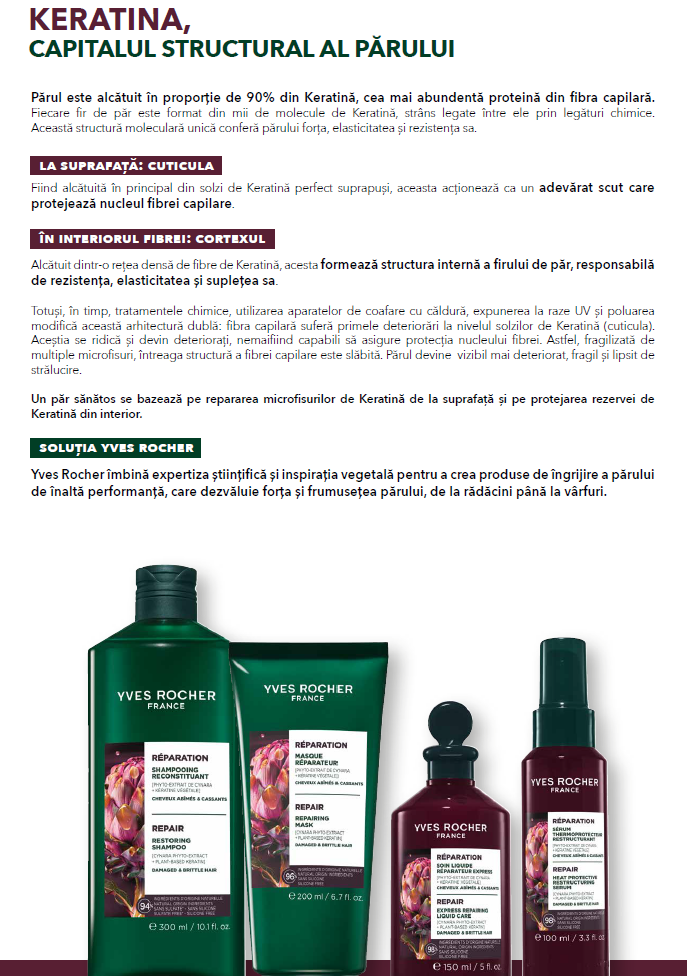 Gama Repair de la Yves Rocher este dedicată părului deteriorat și fragil, având ca obiectiv principal